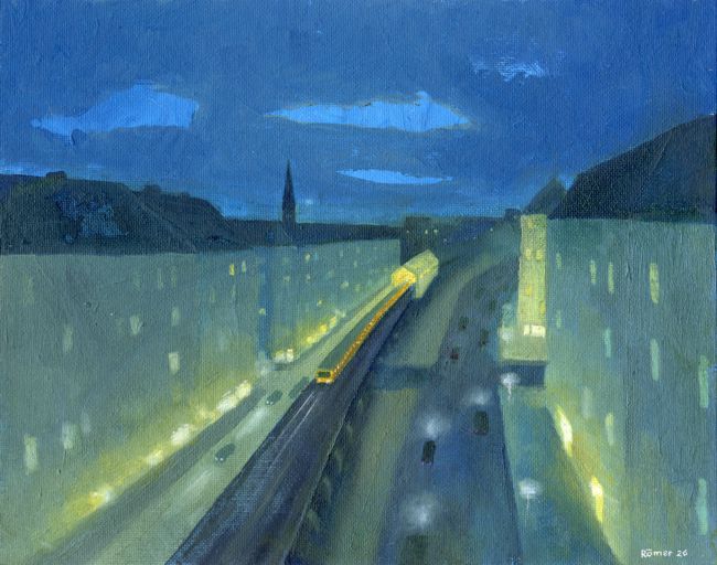 Eberswalder. Öl auf Leinwand. Michael Römer. Das Bild zeigt den U Bahnhof Eberswalder an einem Regentag. Blick auf die Treppen, die zur Hochbahn hinaufführen. In der Blauen Stunde sind Lichter zu sehen.